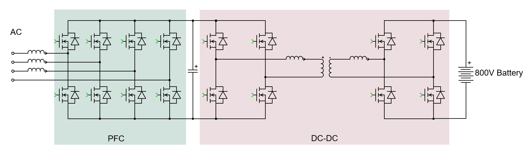 Figure 1. Onboard Charger (OBC) topology example: bidirectional B6 Totem-pole PFC (left part) and Dual Active Bridge (DAB) DC-DC (right part)