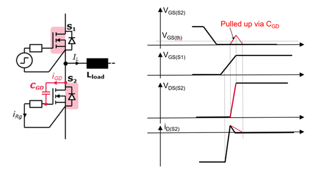 Figure 4. Parasitic turn-on illustration: in a half-bridge circuit (left) S2 just switched off (body diode freewheeling the load current) then S1 is switching on. The parasitic surge is induced at S2 Gate by S2 Drain voltage transient via parasitic capacitance C