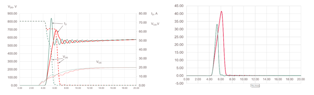Figure 10. Simulated switching curves and losses with the Gate driver referenced to Sense Source (green, recommended) vs Power Source (red, not recommended)