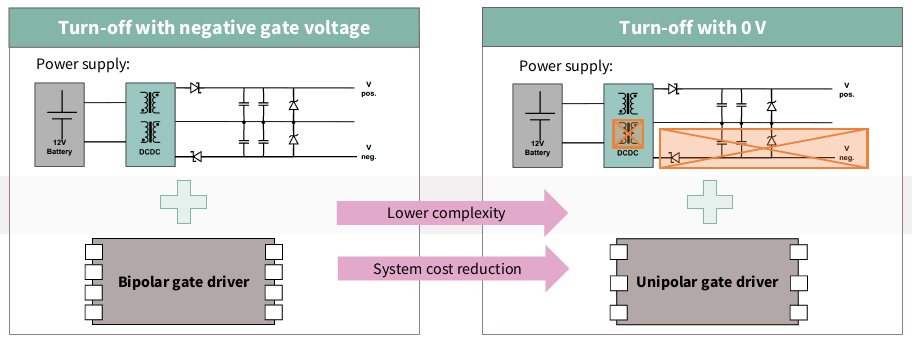 Simplified unipolar gate driver made possible by 0 V turn-off with reduced driving power thanks to low Q G