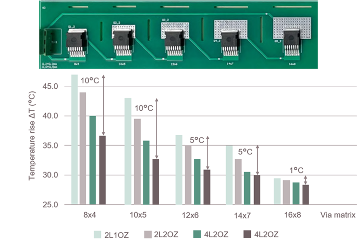 Figure 14. Test board for comparing TO263-7 footprints on FR4 PCB with different configurations of layers, copper thickness, and a via matrix setup (PCB on top). The graph represents respective values of temperature rise. Results show the impact on thermal performance by thermal vias (8x4 to 16x8 matrix), copper layers (2L or 4L), and copper layer thickness (1OZ or 2OZ).