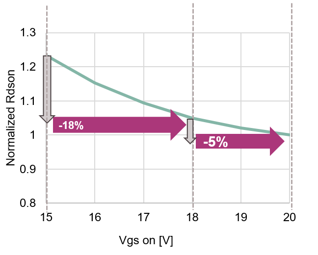 Figure 15. The graph illustrates the R ds(on) reduction with increased V gs(on) value: by 18% with V gs(on) changing from 15 V to 18 V and an additional 5% from 18 V to 20 V