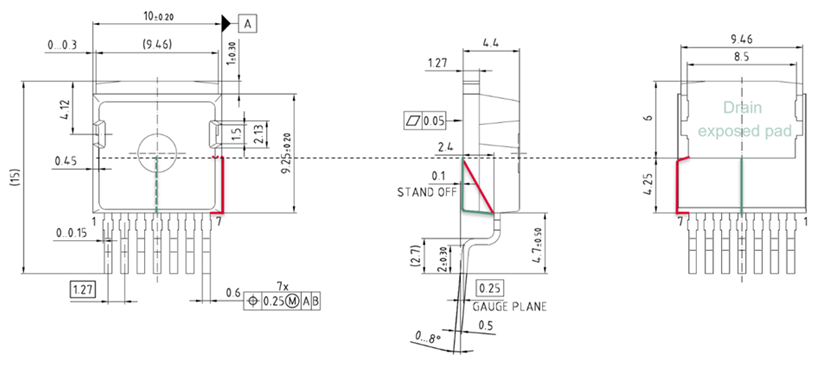 In the design of the TO263-7-12 package, the optimal balance is found between the thermal performance set by the leadframe’s exposed pad area and the creepage distance along the package surface from the Source leads to the Drain pad. As a result, the highest on the market (for the TO263-7 package) creepage distance of 5.89 mm is achieved (the shortest creepage paths along the package are shown in