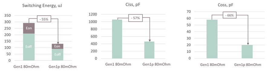 for the 80 mΩ parts. Both switch-on and switch-off energy values of Gen1p 80 mΩ device reduced more than 2 times compared to Gen1. This allows for a much higher switching frequency (and thus smaller inductors) while keeping the same switching losses or having much lower switching losses (and less cooling effort) at the same switching frequency. The same implies to the output capacitance C