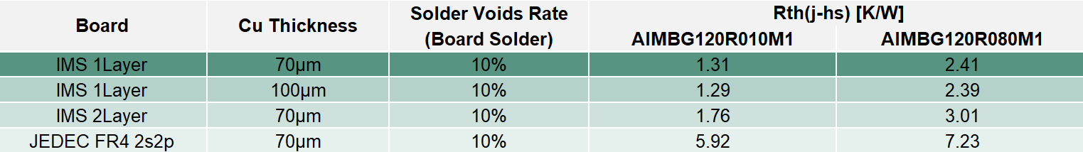 Using IMS (Insulated Metal Substrate) board is highly recommended for optimal thermal management keeping junction temperature below the designated level. Results of the thermal simulations with 10 mΩ part AIMBG120R010M1 (biggest chip size) and 80 mΩ AIMBG120R080M1 indicate the thermal performance that can be reached for these types with different types of PCBs (