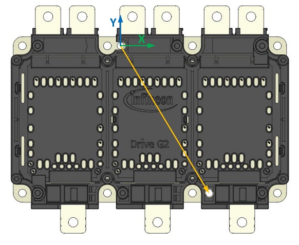 HybridPACK™ Drive G2 power modules come with a new coordinate reference system, which is defined by two 4 mm holes in the baseplate. The x-hole is at the side of the six DC power tabs and the slotted y-hole is at the side of the three AC power tabs. The holes are designed to mate with alignment domes that can be implemented by the customer.