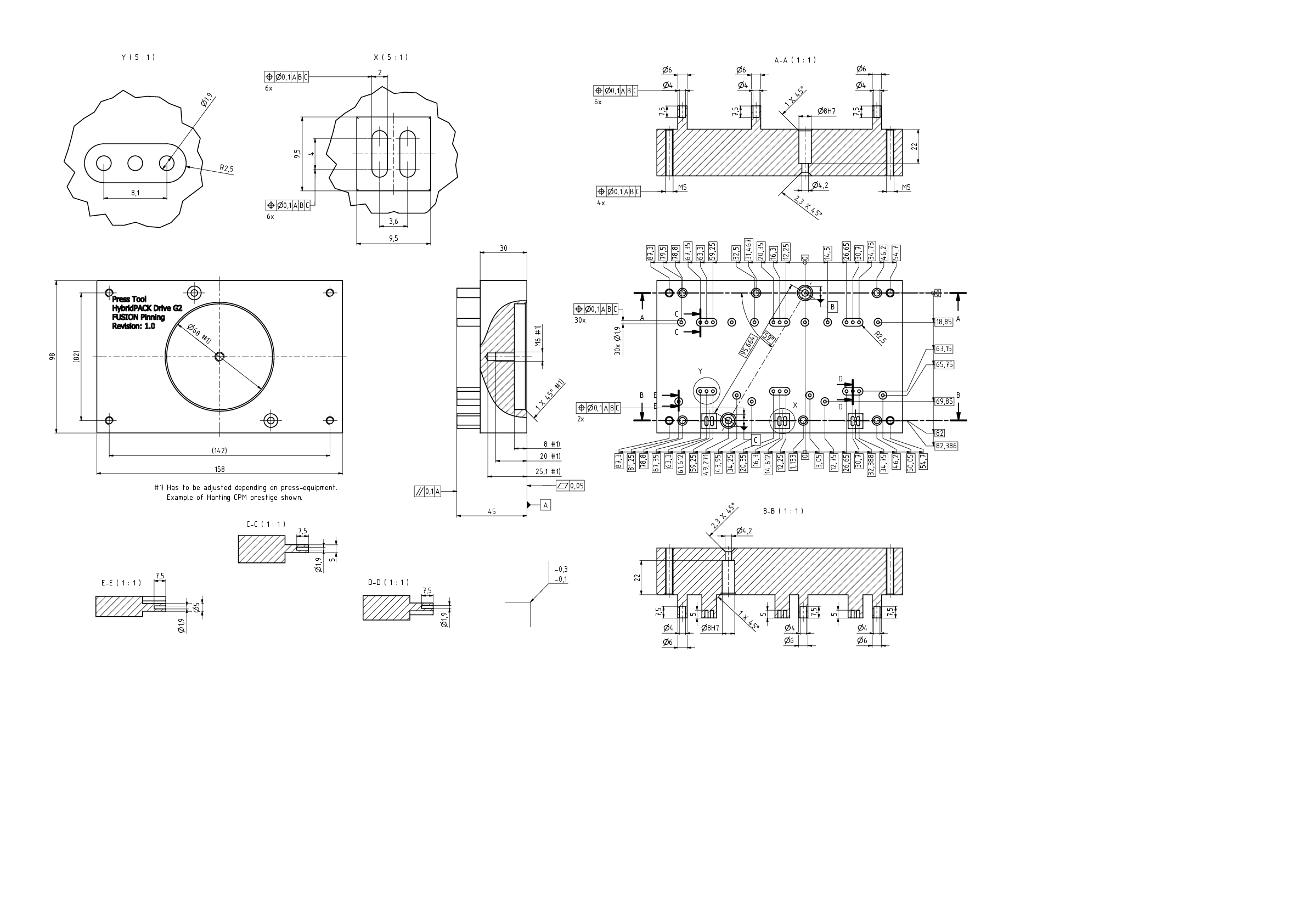. The signal pin pattern is adjusted to IGBT or SiC MOSFET power modules but the principle hole pattern specification from the drawing will remain the same. The real production equipment might have a different appearance but the hole pattern and test method remain the same as shown in