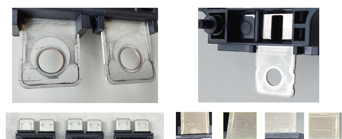 The power tabs are made of copper with a partial tin plating. The plating avoids visual discoloration and oxidation of the copper between power module production and mounting processes. After assembly, the tin plating has no function; the contact resistance is the same as an unplated pure copper power tab. To provide the maximum possible compatibility to various connecting techniques like screw type connections, clinching, and welding, it is mandatory to make the plating as soft as possible. Due to the desired compatibility and the required softness, visible scratches and/or not completely overplated edges due to the stamping process are of logical consequence (i.e., partial plating); it does not influence the product performance or quality.
