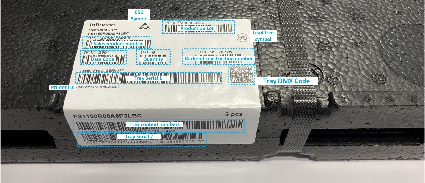 Tray Serial 2: This number is the preferred option for traceability measures because it is also readable if trays are stored in a stack. The number is a composition of the back-end construction number, production lot, tray serial number, date code, and quantity. In this example, it contains the following data: X95076726 1T7M000056E0 S738389 D2301 Q6