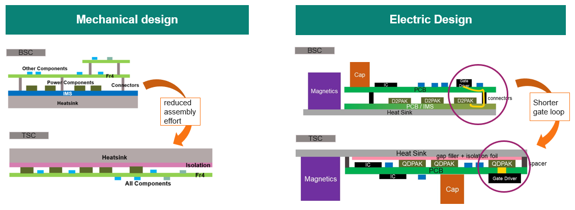 Using surface-mounted TSC devices can significantly increase the power density of the system. The separation of electrical and thermal paths eliminates the need to use the IMS board normally used for Bottom Side-Cooled (BSC) devices to achieve low system Rth. Instead, a standard FR4 PCB can be used effectively with the driver circuit and other components placed on both sides of the PCB. From the mechanical design perspective, this can result in fewer PCBs stacked, with less volume required, as well as lower interconnect and assembly efforts (