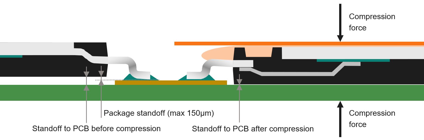 When compression force is applied, the distance between the package and PCB is reduced while leads are acting as springs. With the application of sufficient compression force (around 100N per package), the package almost touches the PCB (