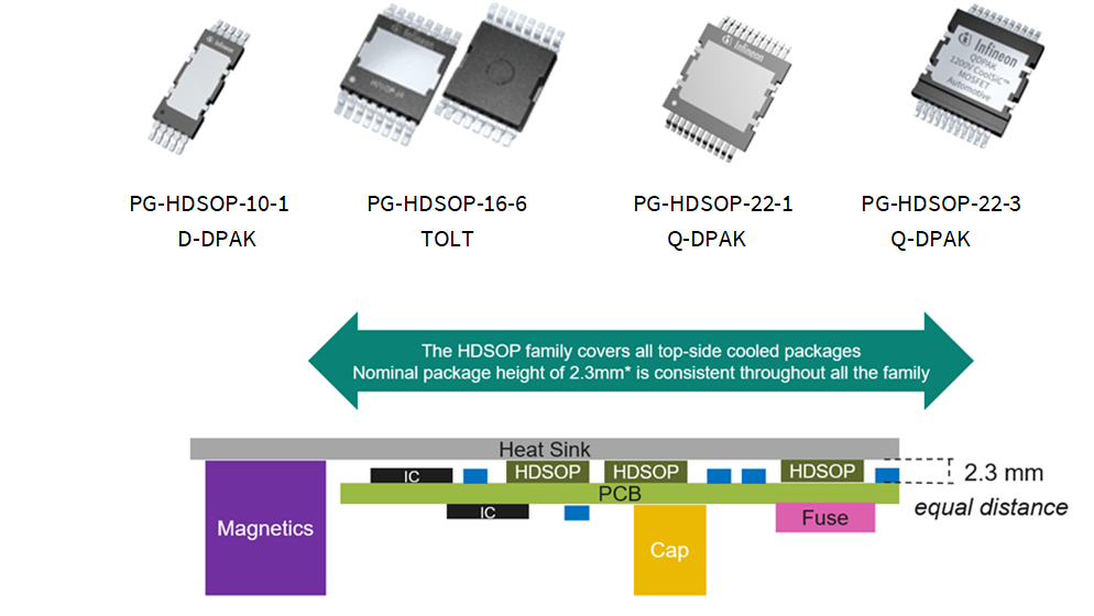 ). All HDSOP packages have the same height of 2.3 mm which simplifies the heatsink construction in case different HDSOP packages are mounted on the same PCB.