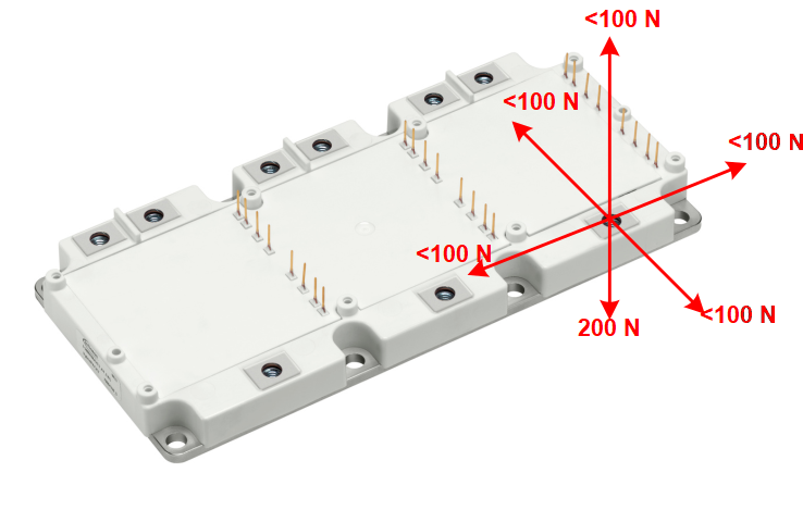 A recommended assembly schematic is shown in Figure 12, in which a bus bar is connected to the power terminals in such a way that only a low force is applied to them, even during shock or vibration conditions, to provide the best possible strain relief. The power terminals are able to withstand the force F best in the direction from the terminal to the baseplate. Force in other directions must be avoided. This must also be taken into account in the tolerance of the bus bar.