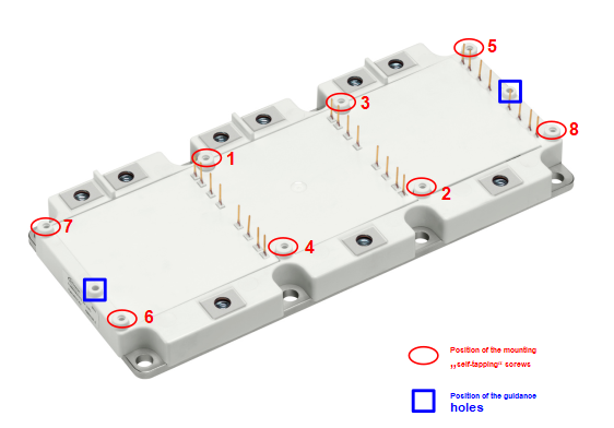 The HybridPACK™ 2 offers two guidance holes marked in blue, as shown in Figure 2. These guidance holes provide assistance when mounting the PCB on the module and allow automated assembly.