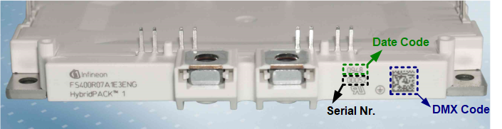 Data matrix is a two-dimensional code that is machine readable with a conventional 2D reader or scanner. Readers are able to read low-contrast marks, damaged codes, and even codes on highly damaged surfaces. A side view of HybridPACK™ 1 is depicted in Figure 11. The marking of the module, together with the data matrix (DMX)-Code, Date Code, and Serial Nr, can be seen in this figure.
