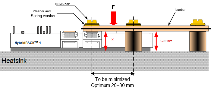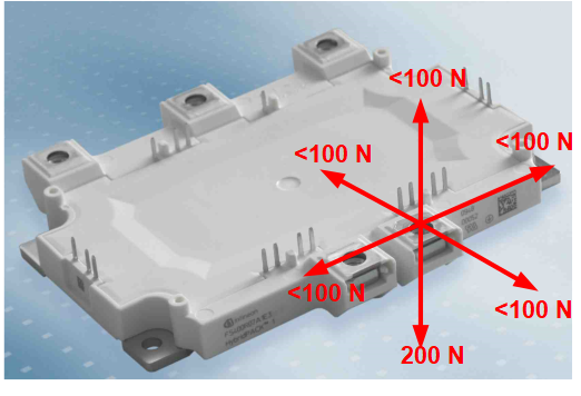 To connect the power terminals with the best possible strain relief, a recommended assembly schematic is shown in Figure 10, in which a bus bar is connected to the power terminals in such a way that only a low force is applied to them, even during shock or vibration conditions. The power terminals are able to withstand the force F best in the direction from the terminal to the baseplate. Force in other directions has to be avoided. This must also be taken into account in the tolerance of the bus bar.