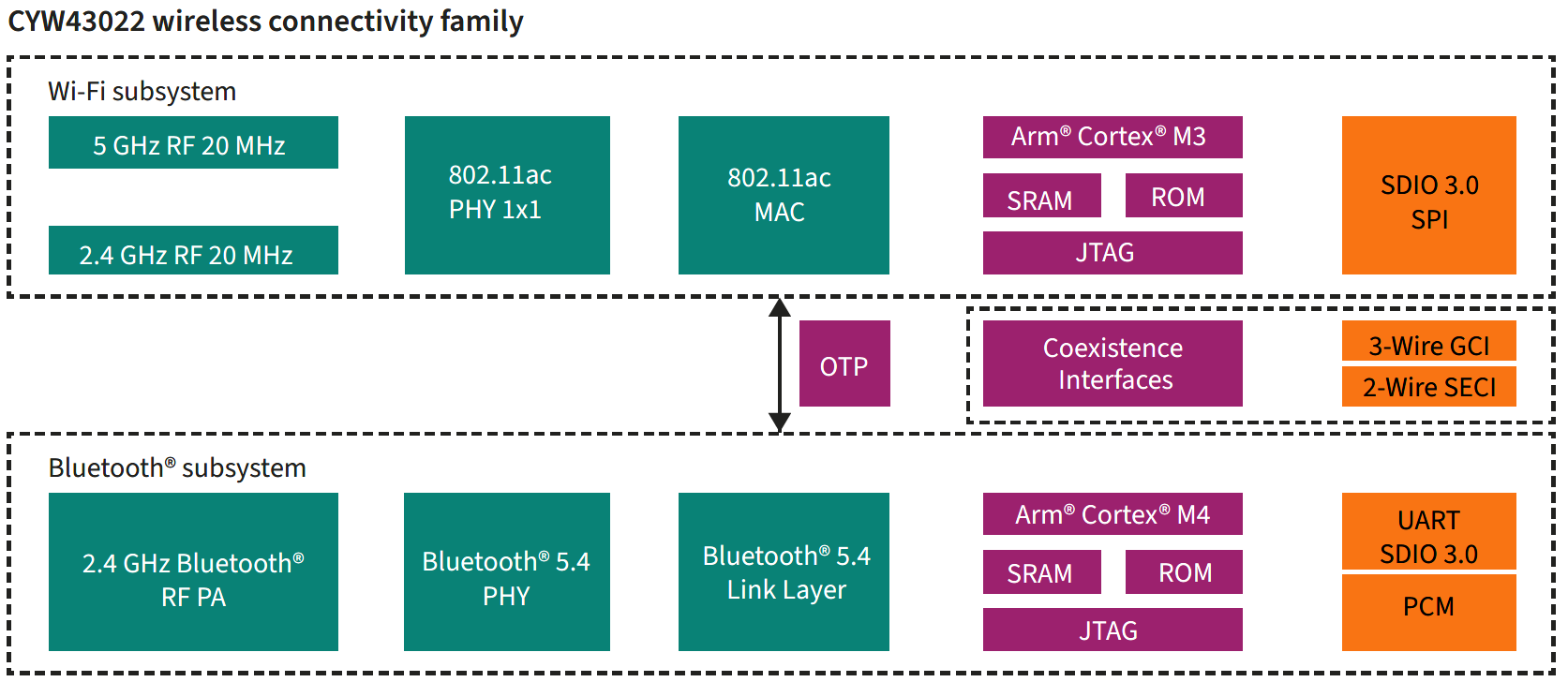 AIROC™ CYW43022 1x1 dual-band (2.4/5 GHz) Wi-Fi 5 (802.11ac) + Bluetooth® 5.4 is an ultra-low-power connectivity device designed to address IoT designs needing minimal power consumption and compact size. Applications such as wearables, IP cameras, and smart door locks are ideally suited for CYW43022 with its low transmit/receive power and optimized Deep Sleep mode. An embedded Bluetooth® stack and Wi-Fi networking offloads allow CYW43022 to save system-level power by handling Bluetooth® and Wi-Fi connectivity activity without the involvement of a host processor.