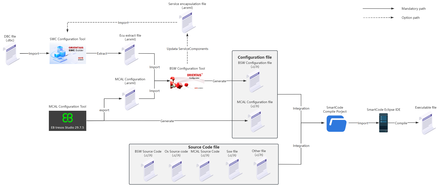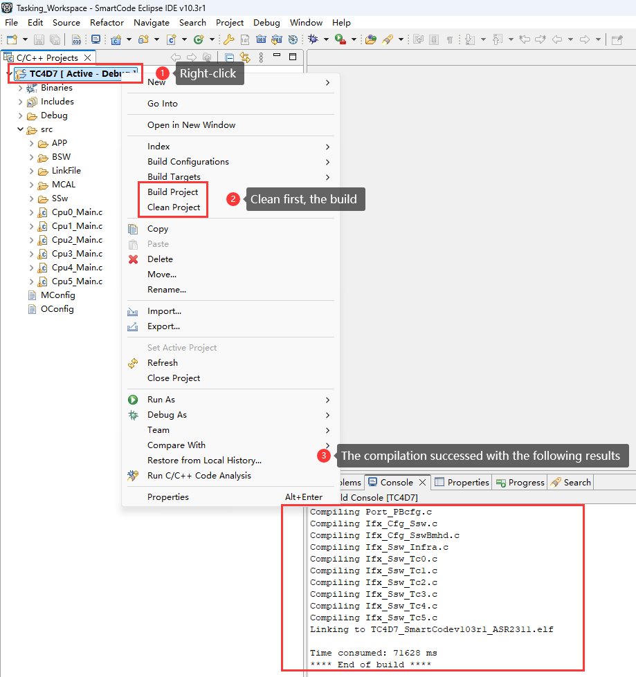 Create a compilation project in the SmartCode Eclipse IDE, integrate the MCAL configuration file generated in step 2, the BSW module configuration file generated in step 3, and various Source Code files into the compilation project for compilation