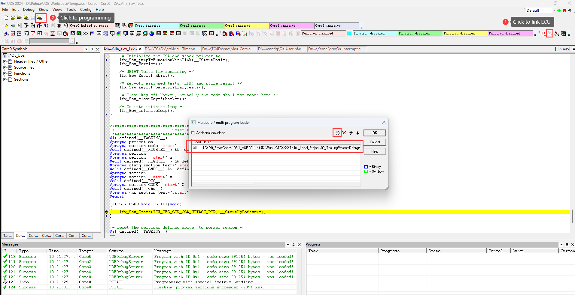 Use UDE 2024 to download the compiled .elf file into TC4D7