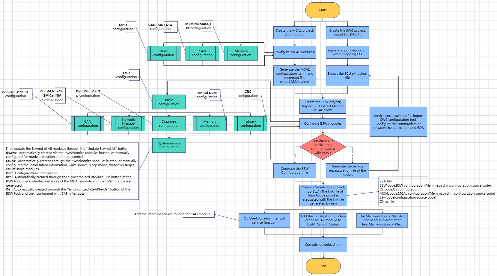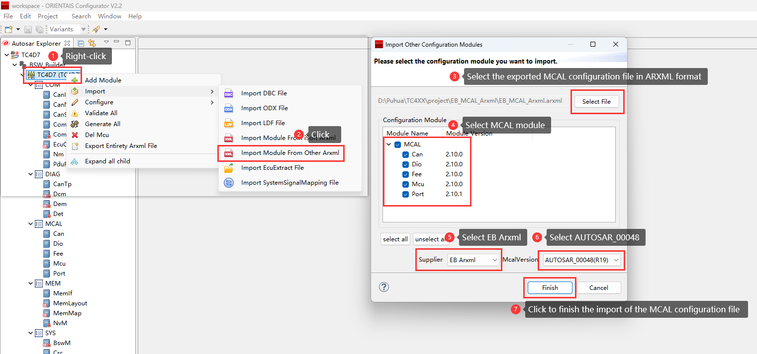Create the BSW project in the BSW Configuration Tool. Import the ECU extract file generated in step 1 and the MCAL configuration generated in step 2 (.arxml format) into the BSW project to complete the configuration of the BSW module and generate the service encapsulation file of the module (optional). Update the bswmd file of the BSW module (Update Bswmd), synchronize Rte/Os (Synchronized Rte/iRte-Os), and generate configuration files