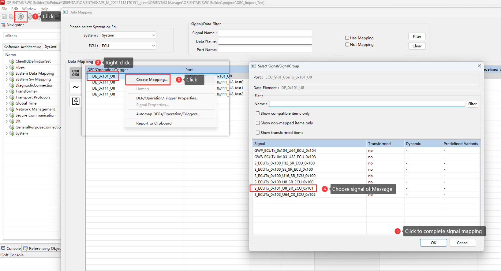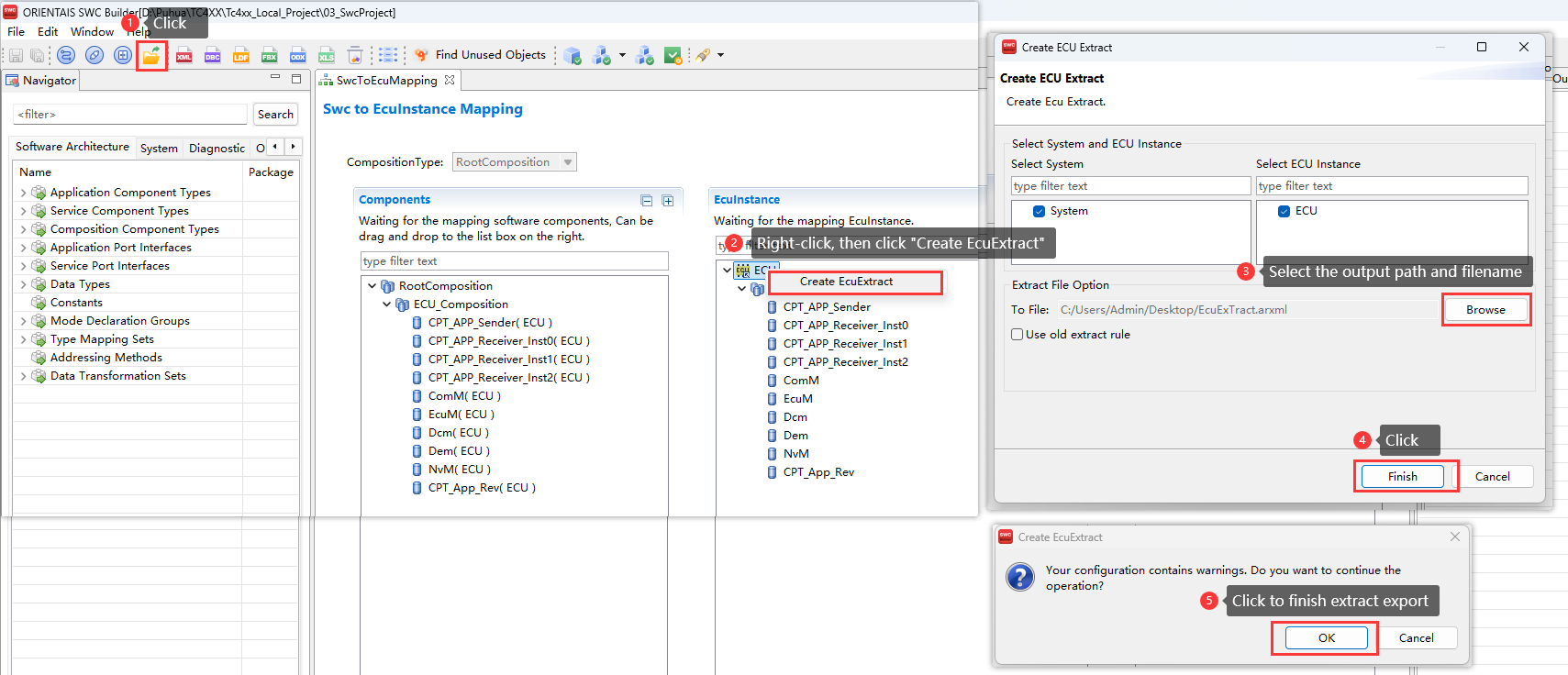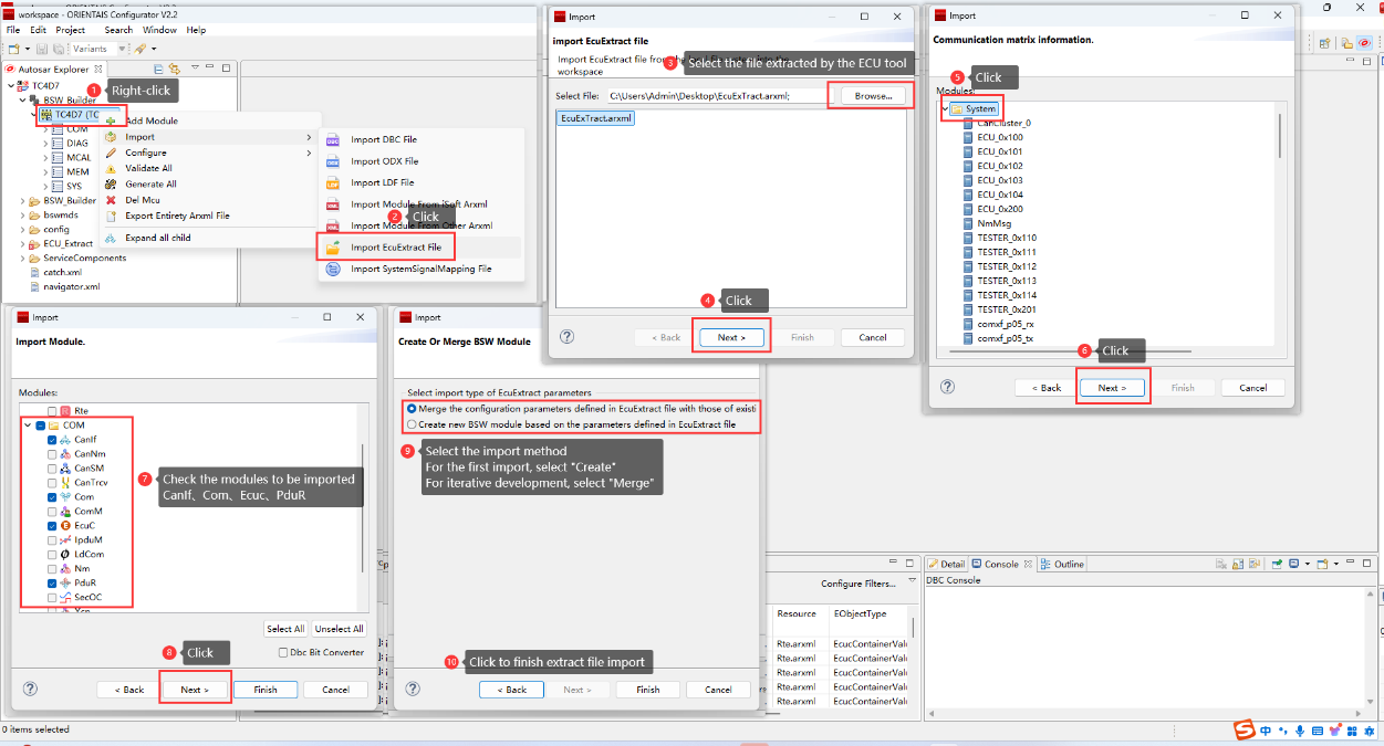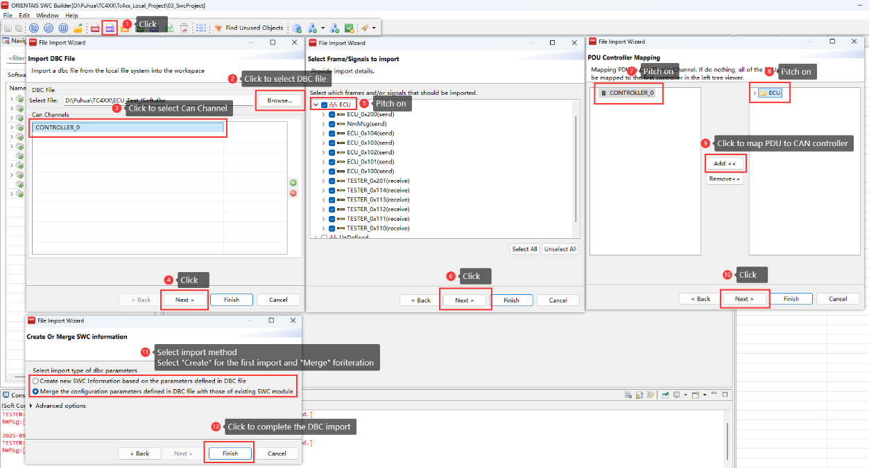Create the SWC project in the SWC Configuration Tool, import the BSW service encapsulation file generated in step 3 (optional), create the application SWC Type, SWC instance, Port connection, and the mapping from the SWC instance to the ECU. Import the DBC file, perform SignalMapping, as well as ECU partitioning and partition mapping. Perform ECU extraction to obtain the ECU extract file