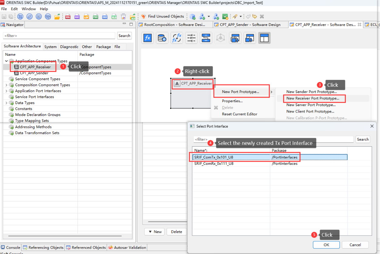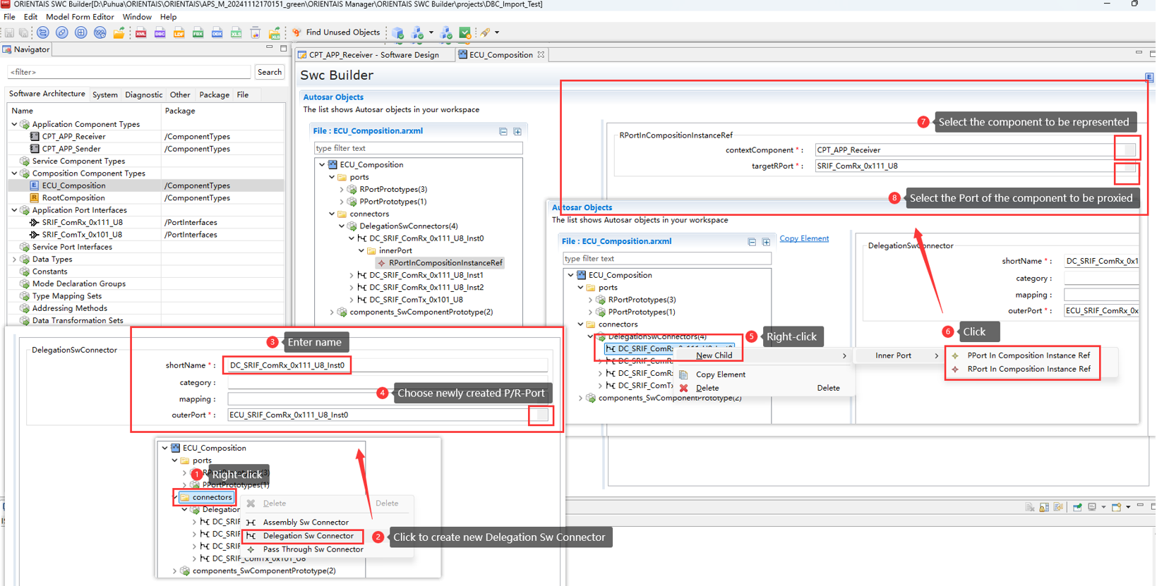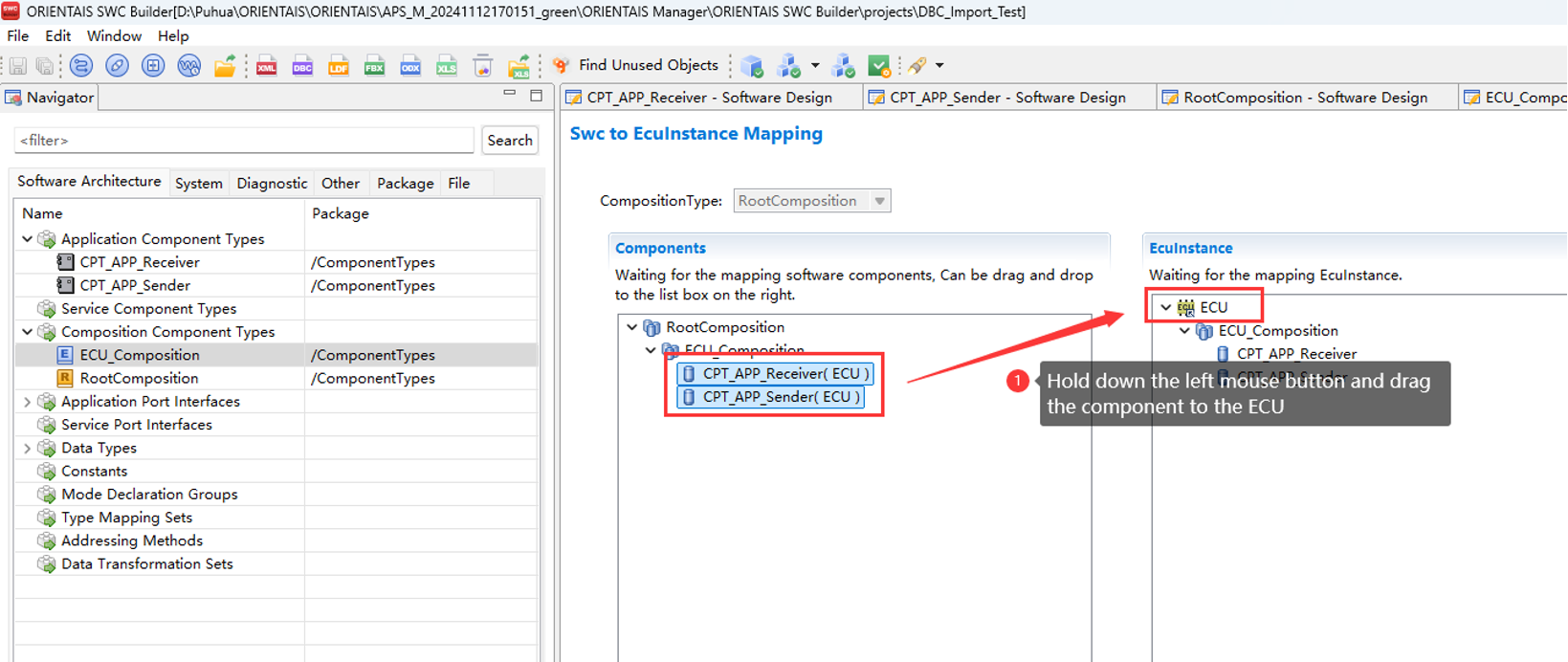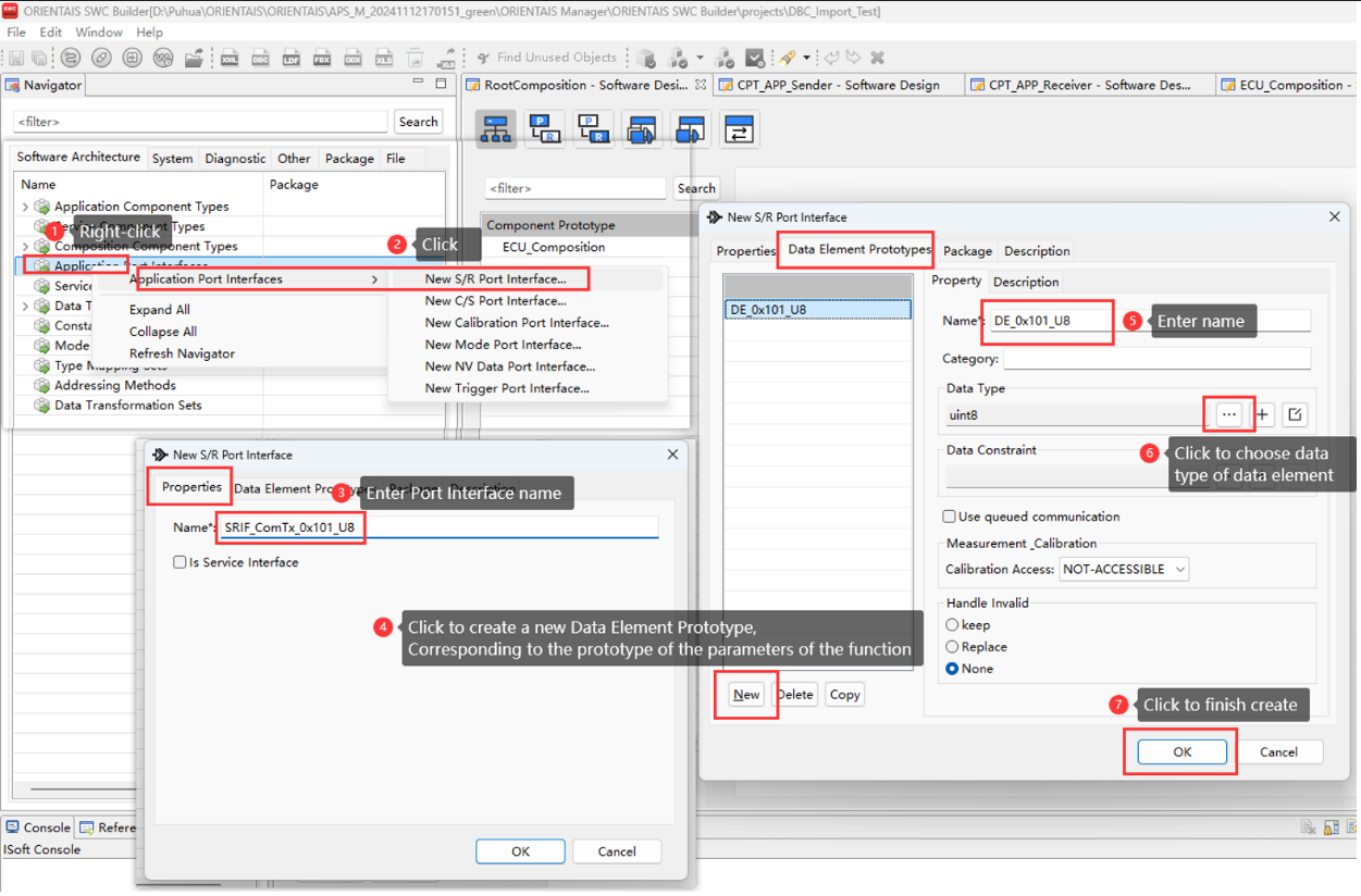 Create the SWC project in the SWC Configuration Tool, import the BSW service encapsulation file generated in step 3 (optional), create the application SWC Type, SWC instance, Port connection, and the mapping from the SWC instance to the ECU. Import the DBC file, perform SignalMapping, as well as ECU partitioning and partition mapping. Perform ECU extraction to obtain the ECU extract file