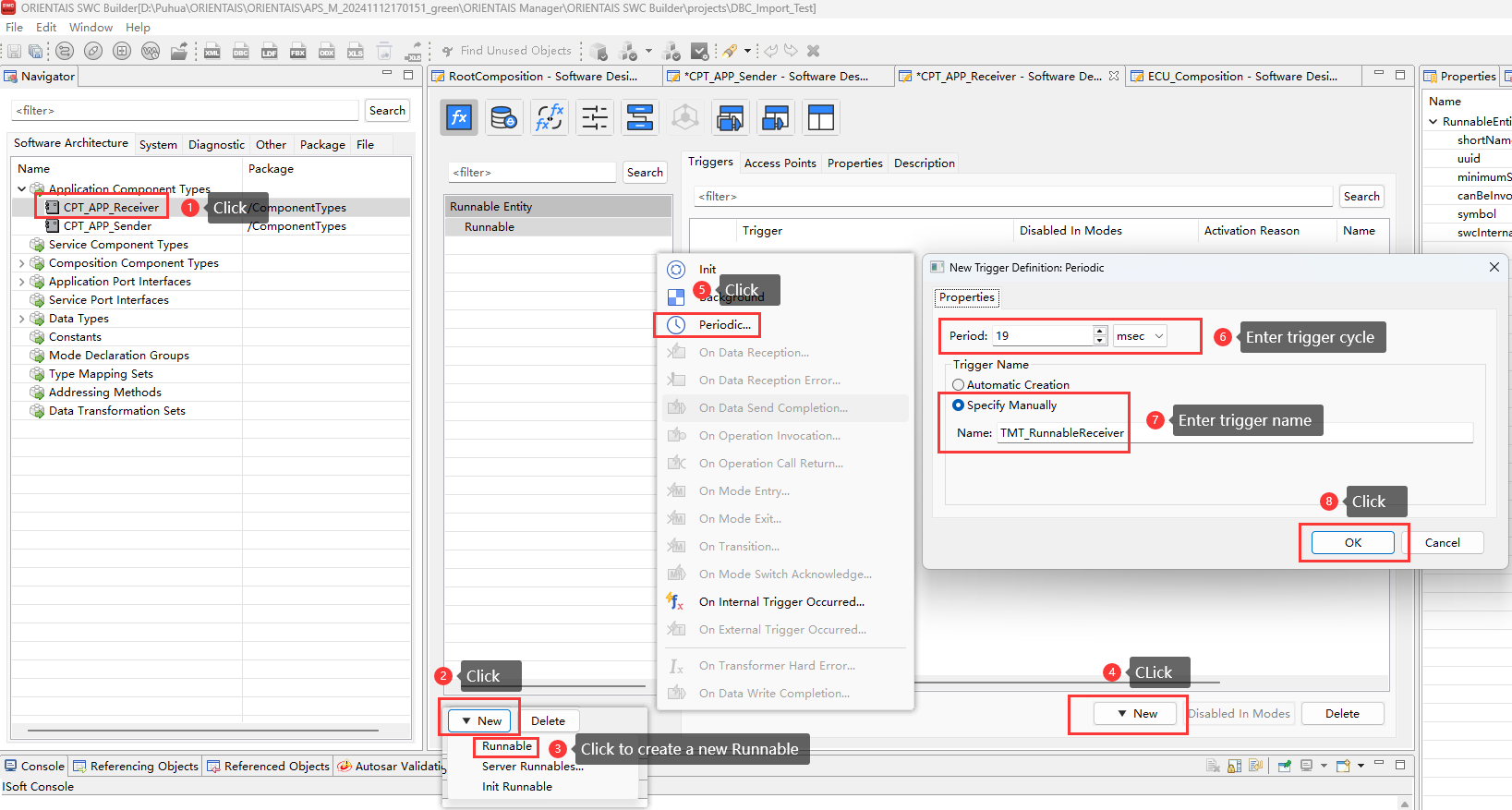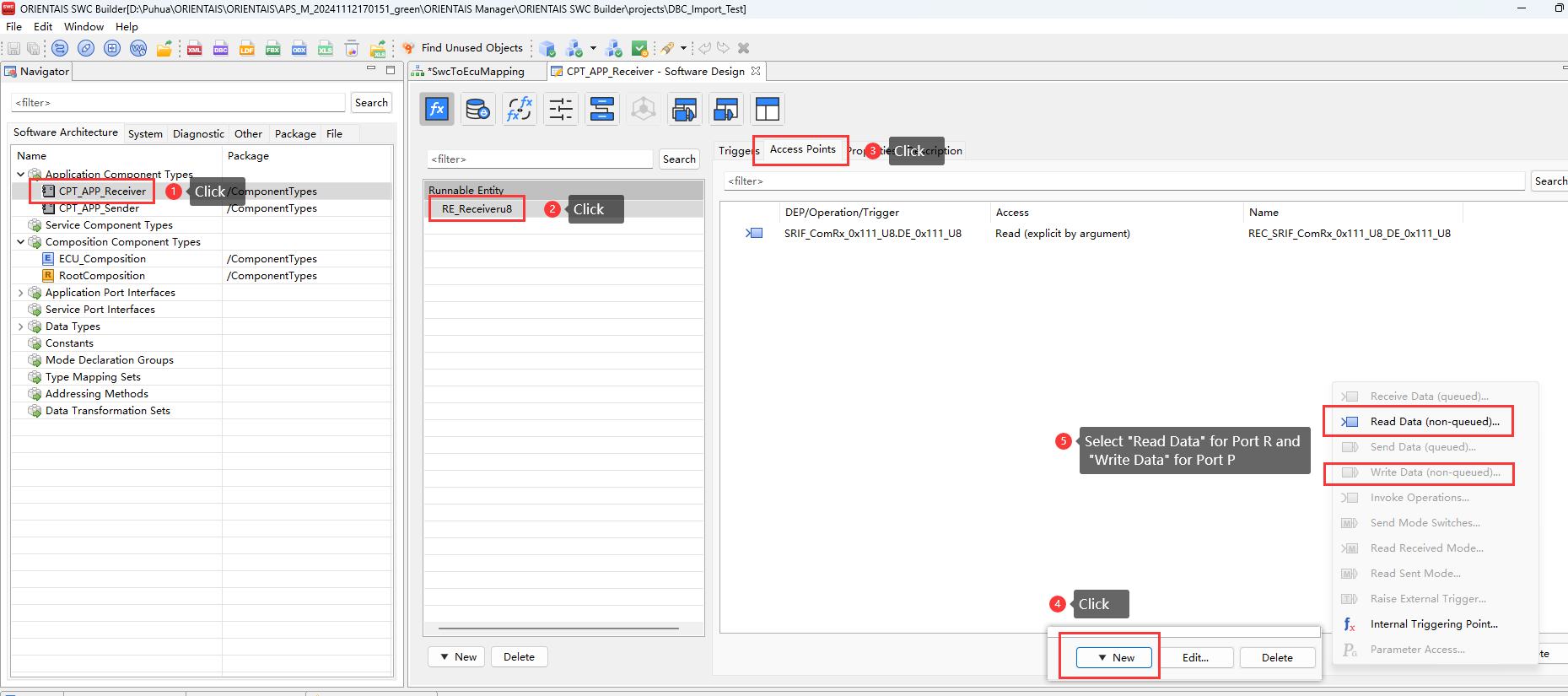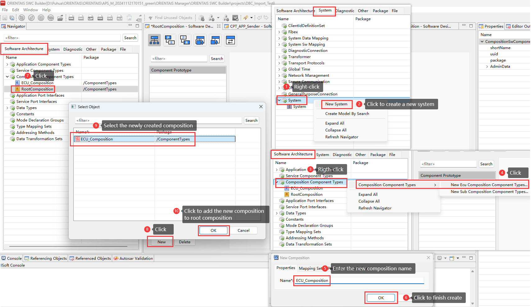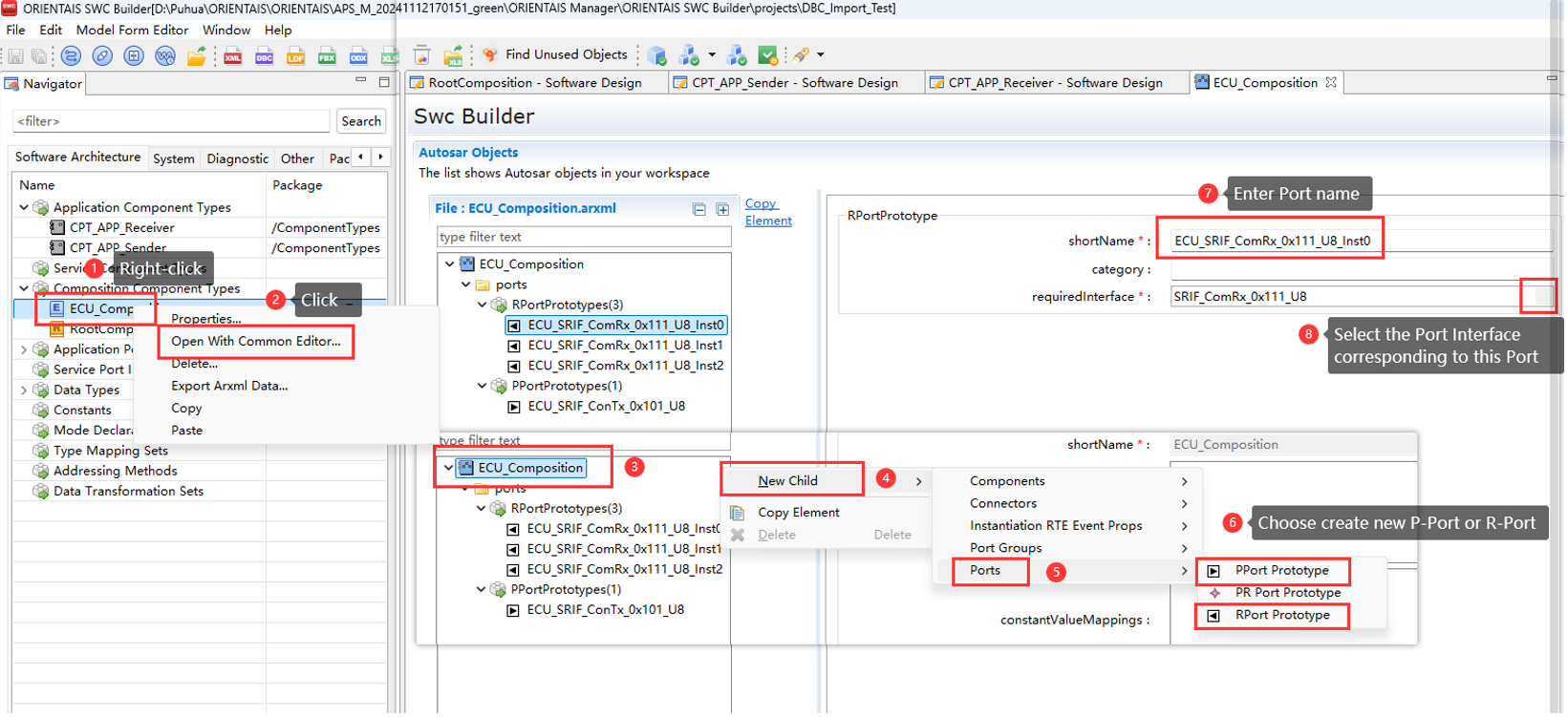 Create the SWC project in the SWC Configuration Tool, import the BSW service encapsulation file generated in step 3 (optional), create the application SWC Type, SWC instance, Port connection, and the mapping from the SWC instance to the ECU. Import the DBC file, perform SignalMapping, as well as ECU partitioning and partition mapping. Perform ECU extraction to obtain the ECU extract file
