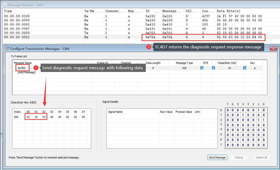 After successful download and execution, Send a diagnostic request message (CAN ID is 0x703) to TC4D7, and TC4D7 will return a diagnostic request response message (CAN ID is 0x70A).