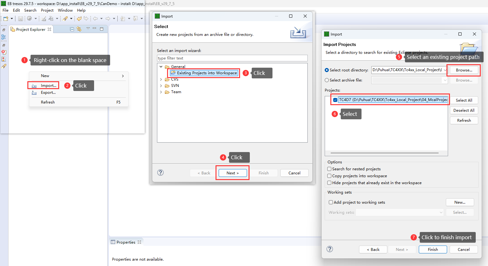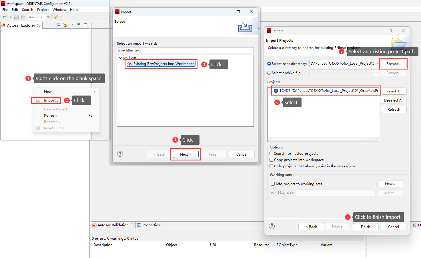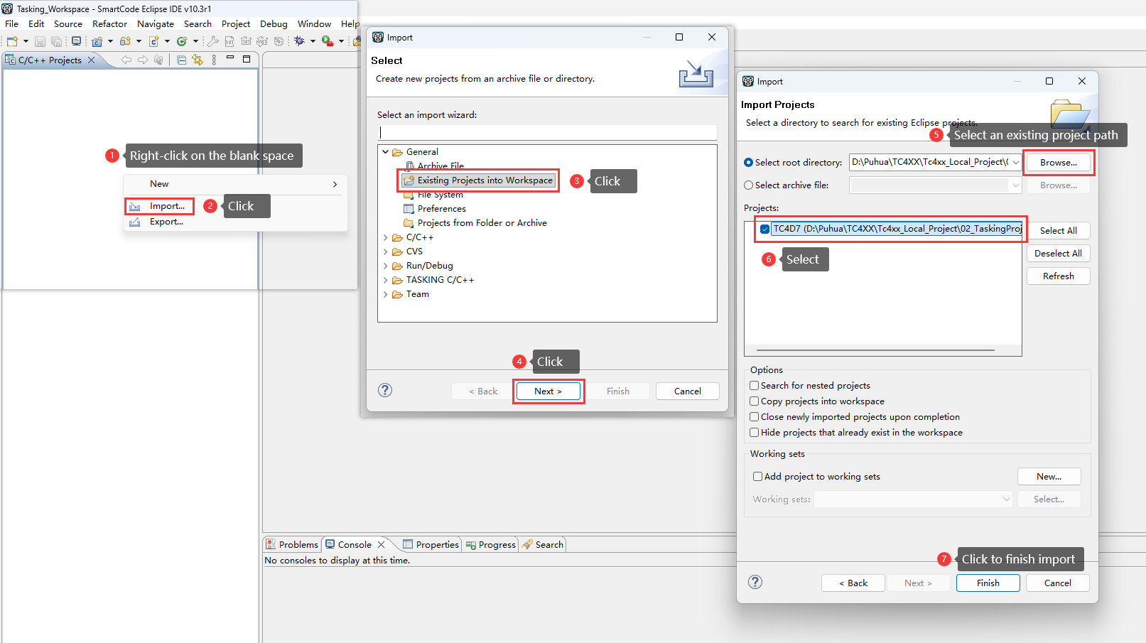 Please import the existing compilation project (02_TaskingProject) into SmartCode Eclipse IDE according to the following steps: