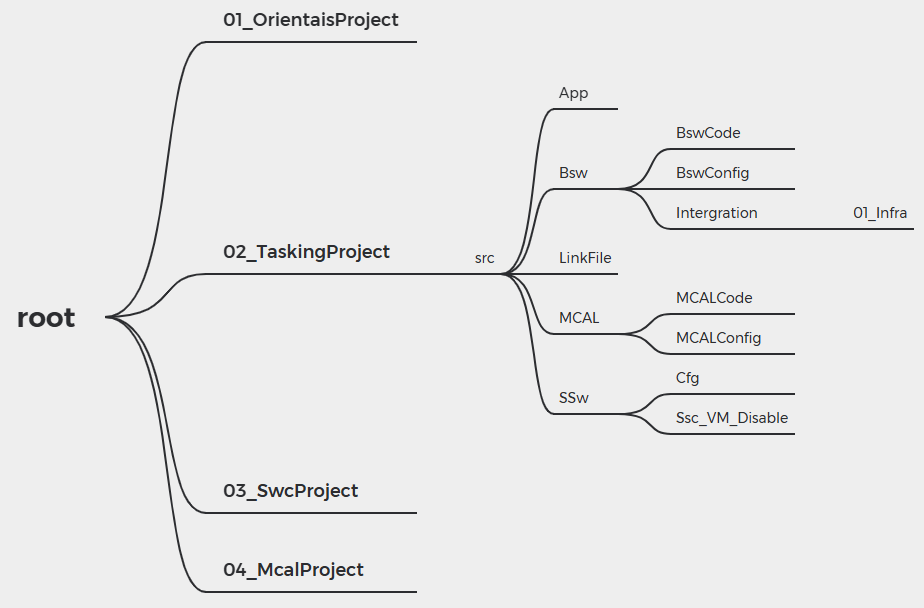 Import the code and configurtion file of MCAL, the code and configuration file of BSW, and the system-related files into the 02_TaskingProject build project, organizing them according to Figure