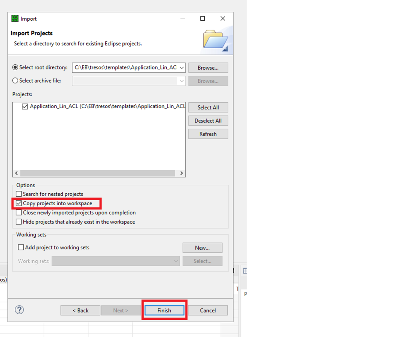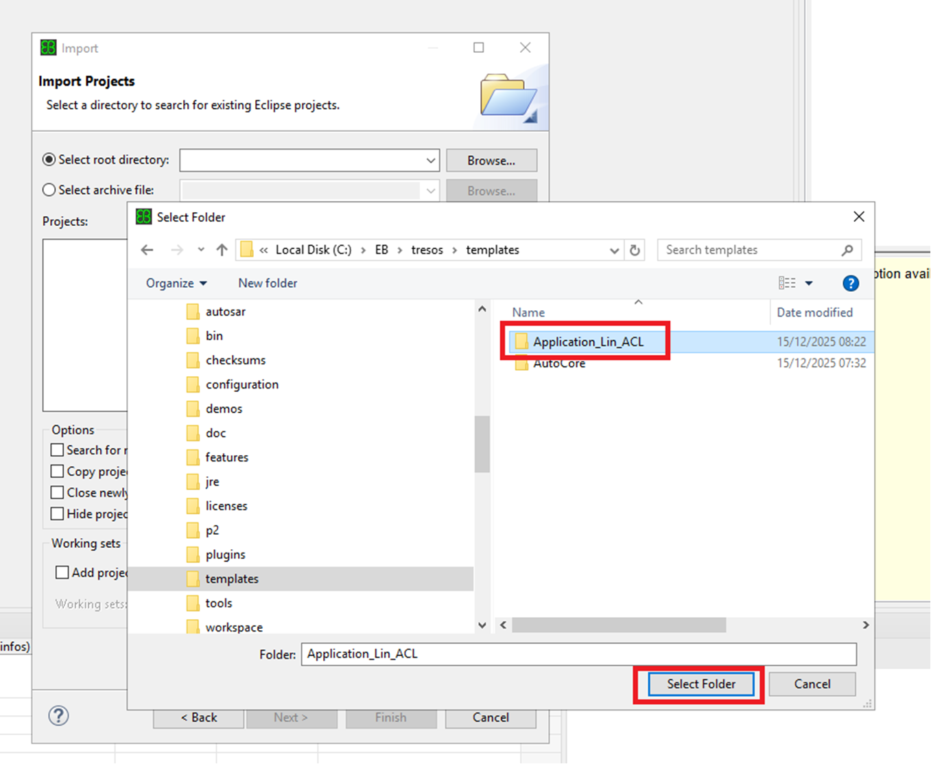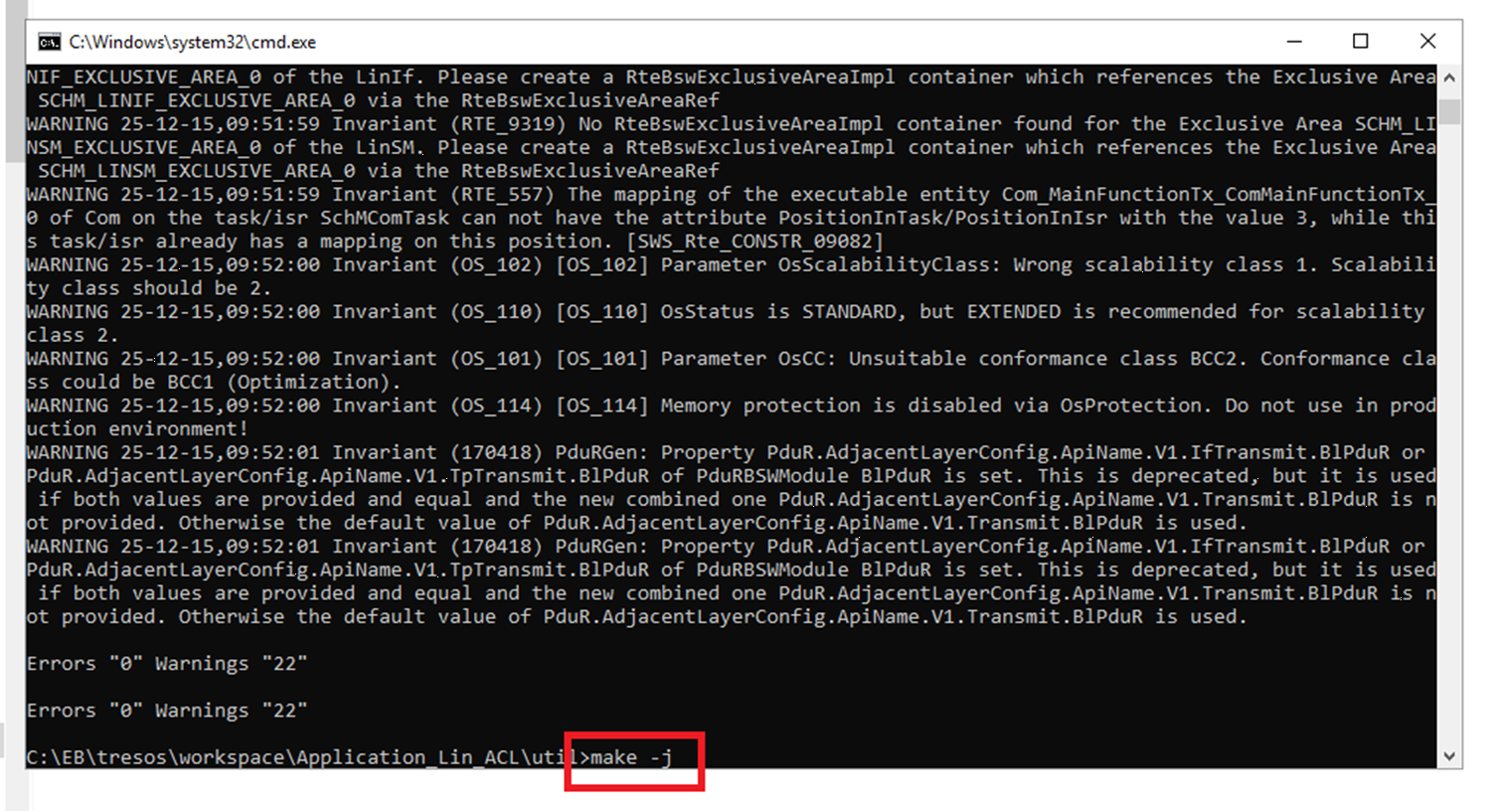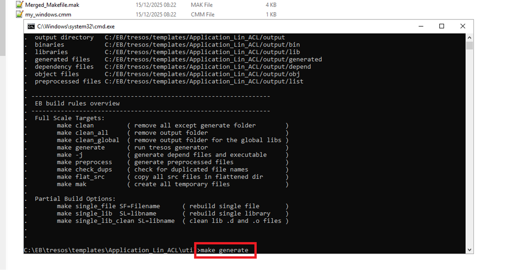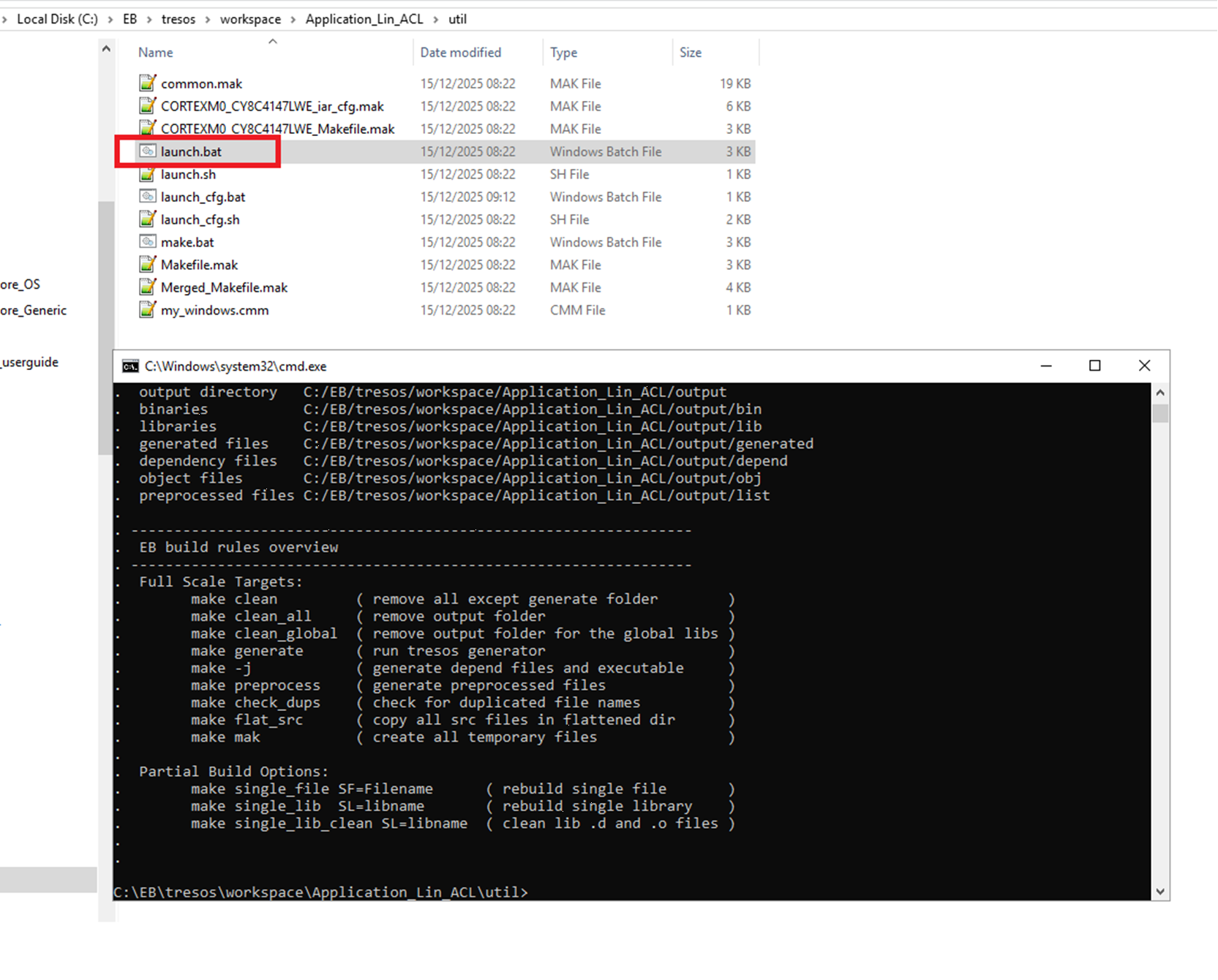 Configure the compiler path by opening/EB/tresos/templates/Application_Lin_ACL/util/launch_cfg.bat, and change the value of TOOLPATH_COMPILER to the installation location of your compiler (for example C:\iar\EWARMFS850)