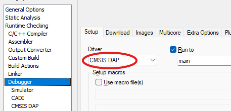 In the debugger options select CMSIS-DAP as the Debugger driver