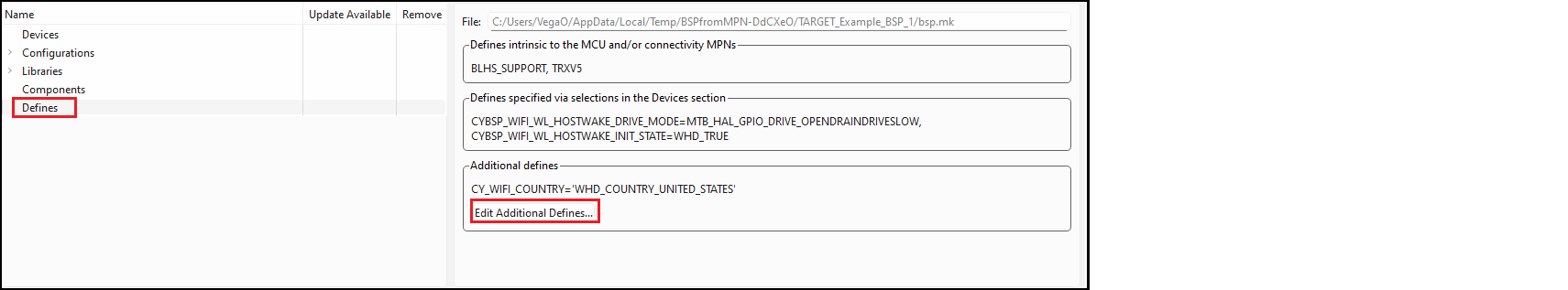 As with the Components section, there are three categories of defines. The first two are read-only values based on the selections in the Devices section. The third includes additional defines. Click