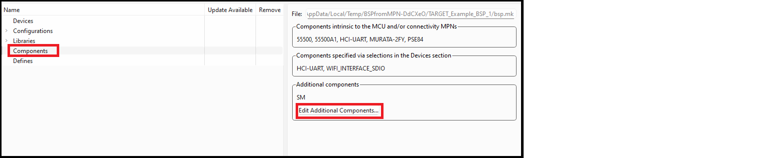 There are three sections: components that are required by the devices that your BSP contains, components that are required based on option selections from the Devices section, and any additional component values. The first two sets are set based on the devices section, so they cannot be modified in the Components section.