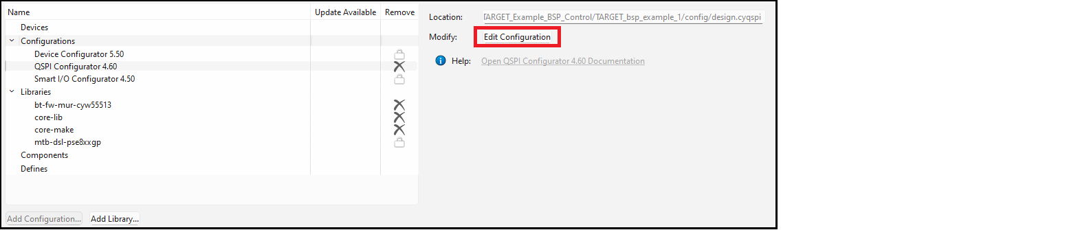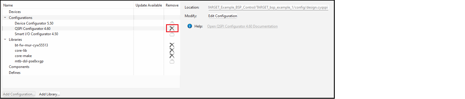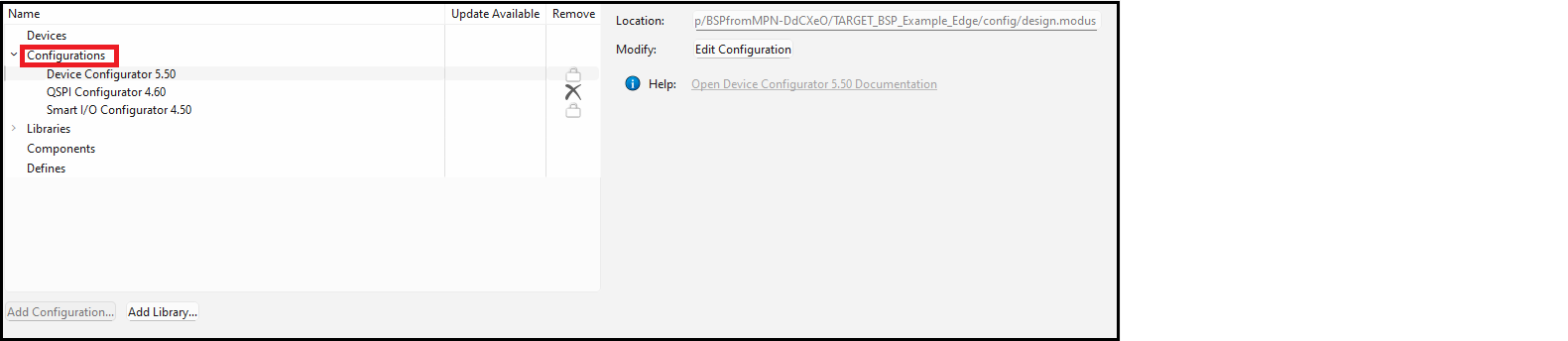 The Configurations section allows you to edit, remove, or add BSP configuration settings for the selected MCU/SOC/SIP and connectivity device. The list on the left shows all configurators that currently have files in the BSP. The