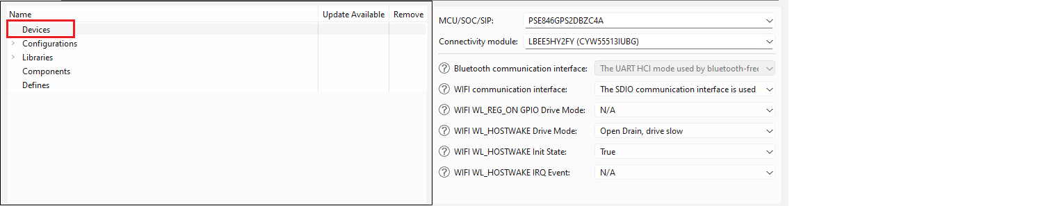 The remaining rows in the Devices section are options that are specific to the MCU/SOC/SIP and connectivity selections that you have made. These are used to select the settings required to get the desired behavior of the devices.