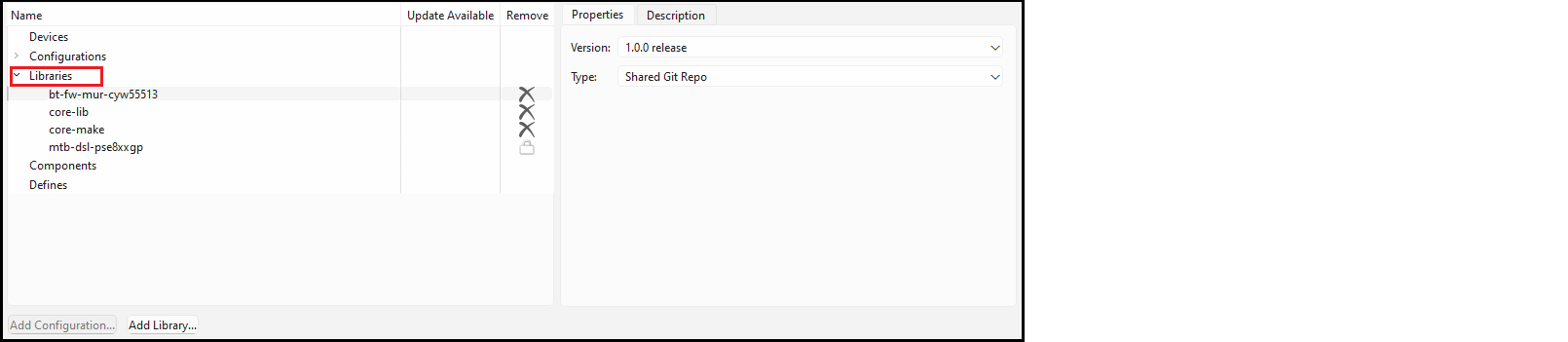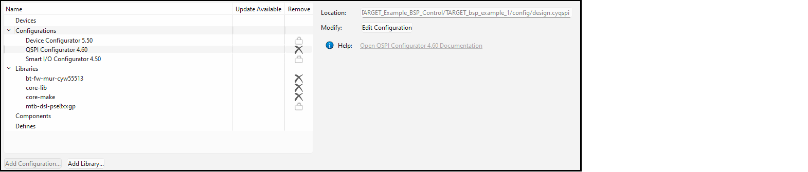 The Libraries section shows all of the libraries that the BSP needs to operate along with any other libraries that have been added. When you first create a BSP, it will list all of the libraries that are required for your BSP, such as the core libraries, recipe libraries, PDL, and HAL. You can change the