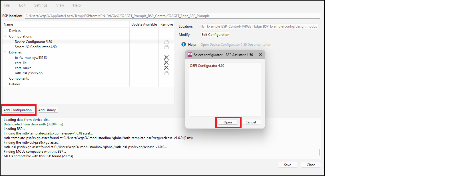 The BSP assistant only operates on BSP configurator files. Library configurators such as the Bluetooth® configurator store their files in the application rather than the BSP, so they are not relevant to the BSP Assistant. For descriptions of the various configurators, refer to the