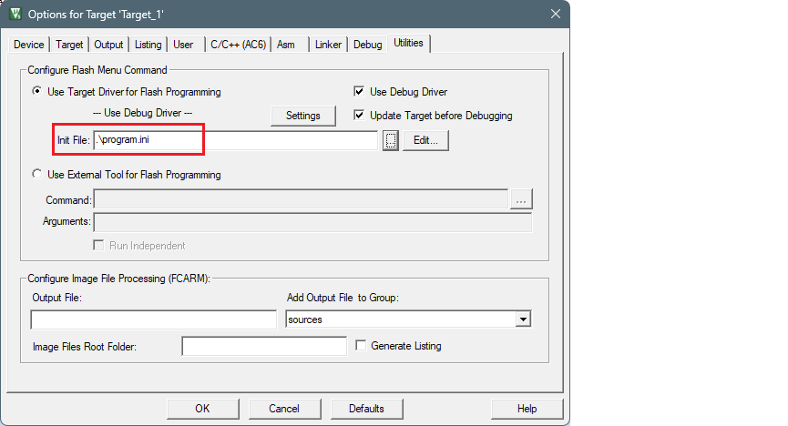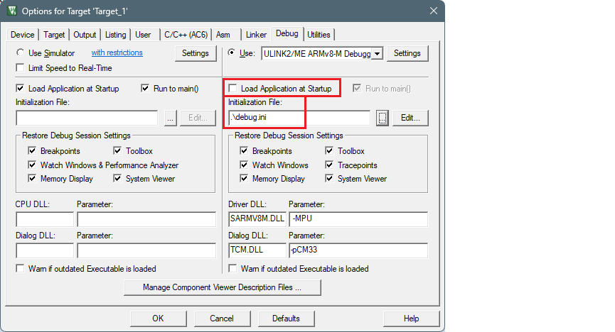 - Select the debug.ini file in the Initialization File field.