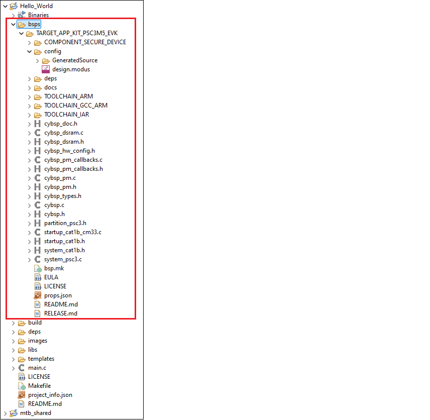 Different BSPs will contain various files, such as the API interface to the board's resources. For example, a typical PSOC™ 6 BSP contains the following:
