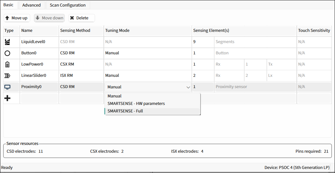 Auto-tuning is a process of finding appropriate values for configurable parameters for proper functionality and optimized performance of the CAPSENSE™ system. SMARTSENSE auto-tuning is an algorithm embedded in the CAPSENSE™ middleware. The algorithm automatically finds optimum values for configurable parameters based on the hardware properties of capacitive sensors. This allows the user to avoid the manual tuning process.