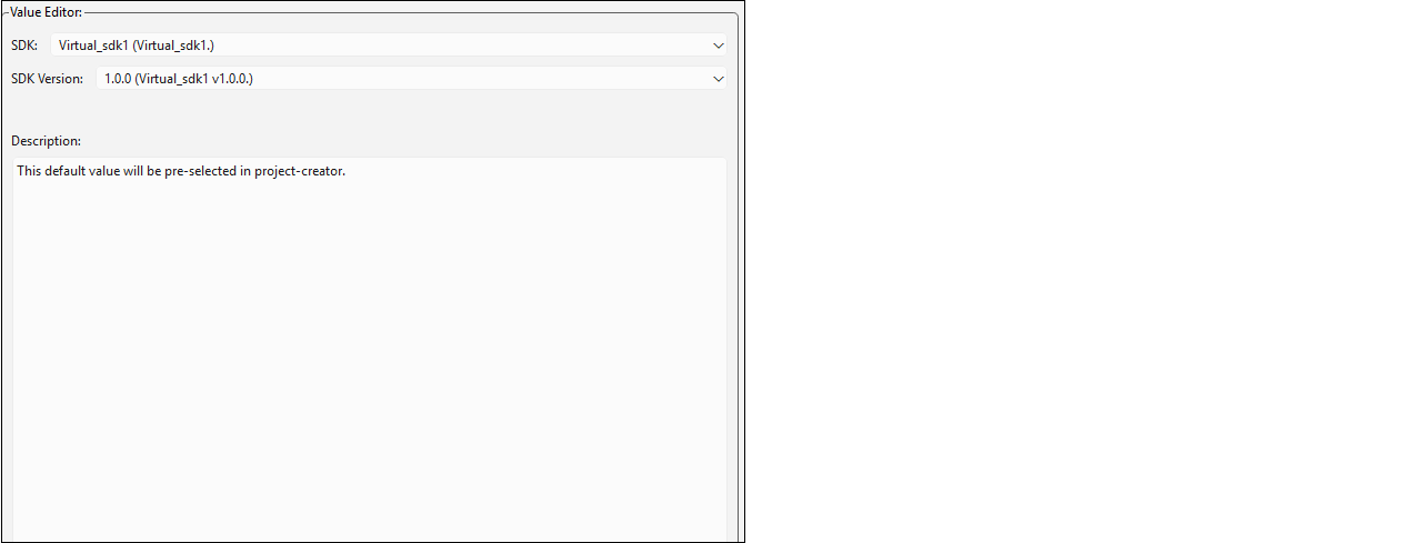 The default SDK setting allows you to select a virtual SDK in various tools like Project Creator and Library Manager. A virtual SDK is a list of assets (kits, applications, libraries, etc.) and specific versions of those assets. For more information on using virtual SDKs, refer to the Project Creator user guide.