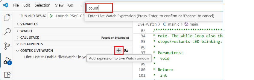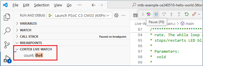 While debugging an application in VS Code, it is possible to add a Live Watch variable. This topic provides an example using the Hello World application.