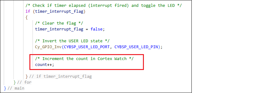 static uint32_t count = 0;Next, locate the main "for" loop. Insert these two lines directly before the loop: