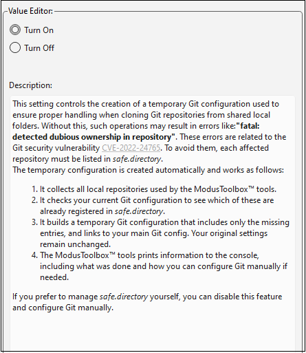 This setting creates a temporary Git configuration used to avoid errors caused when cloning Git repositories from shared local folders. Use the value editor to turn the feature on and automatically create a temporary configuration. Alternatively, you can use the value editor to turn the feature off and configure Git manually.