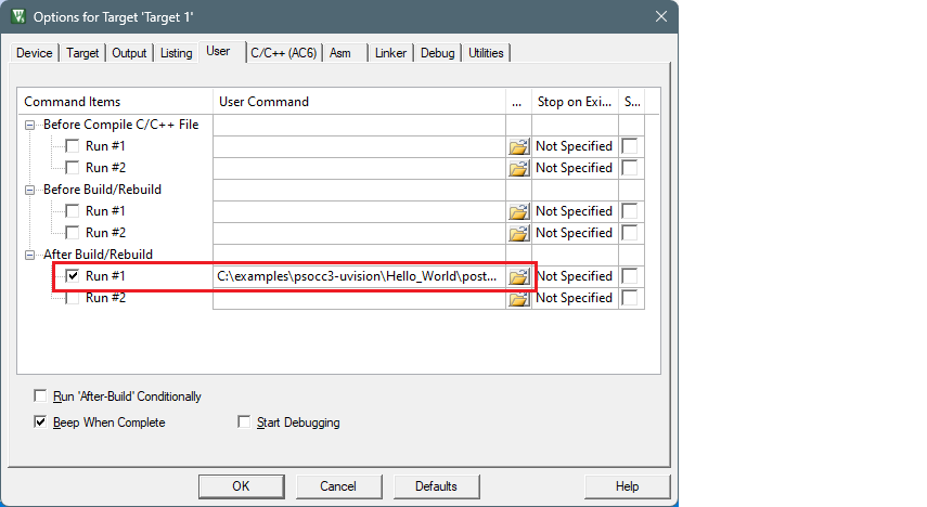 Create a postbuild.bat file in the root directory of the project. The primary purpose of this is to shift the application image from the C-Bus region to the S-Bus region. This is done because the ARM compiler attempts to copy the Load Region to the Execution Region, which is read-only. The bat file contains three separate lines, for example: