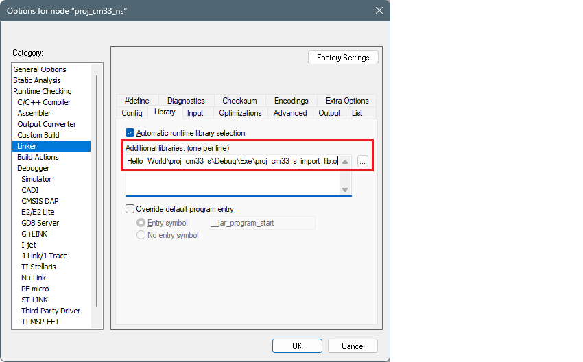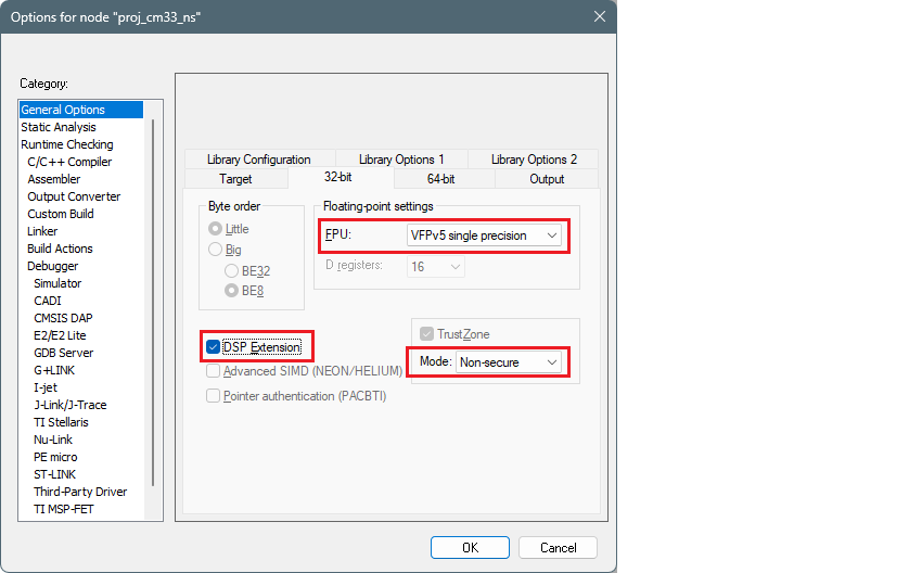 Select the non-secure CM33 project, open the Options dialog, and go to