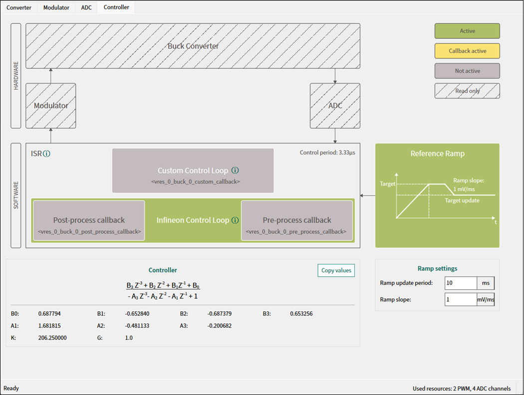 tab, the Power Conversion Configurator configures the controller and displays calculated controller coefficients values.