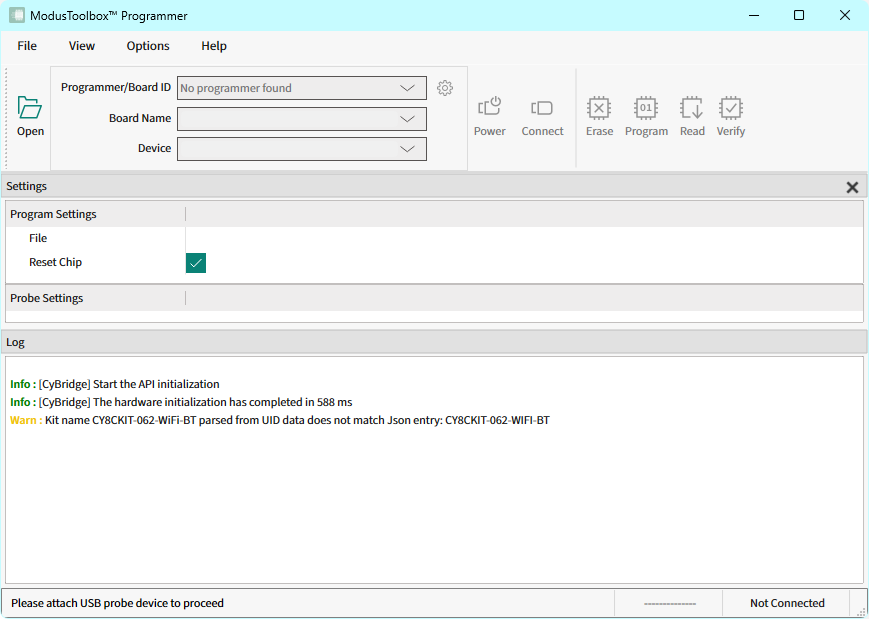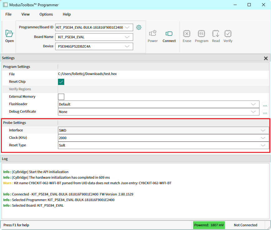 ModusToolbox™ Programmer displays information under Probe Settings.