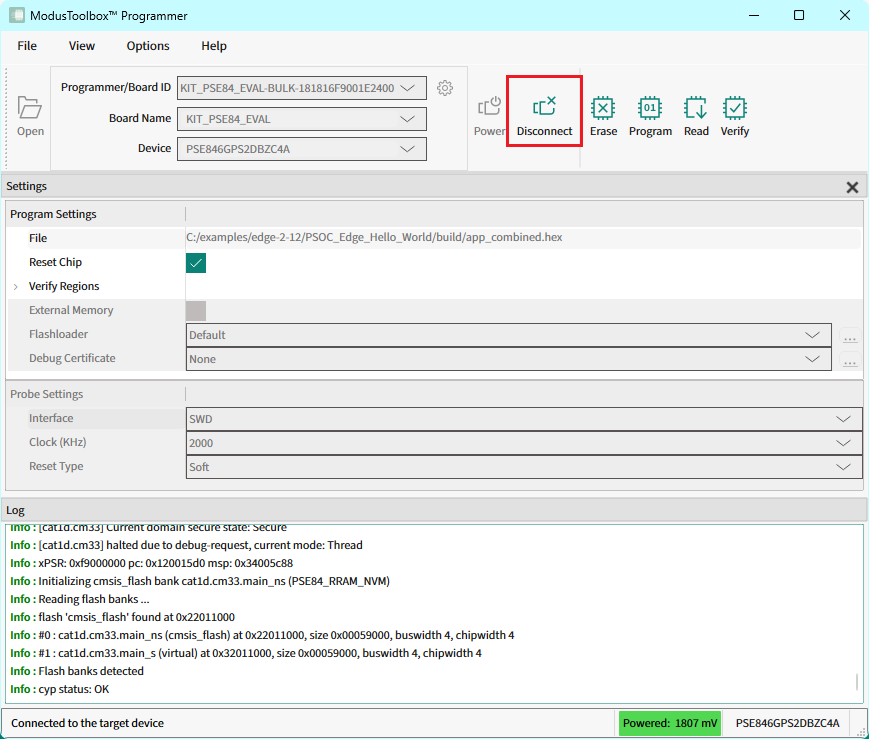 Click Connect . ModusToolbox™ Programmer communicates with the device and displays various messages in the Log . Then, a message in the Status Bar indicates that it is connected. The Connect button toggles to Disconnect .